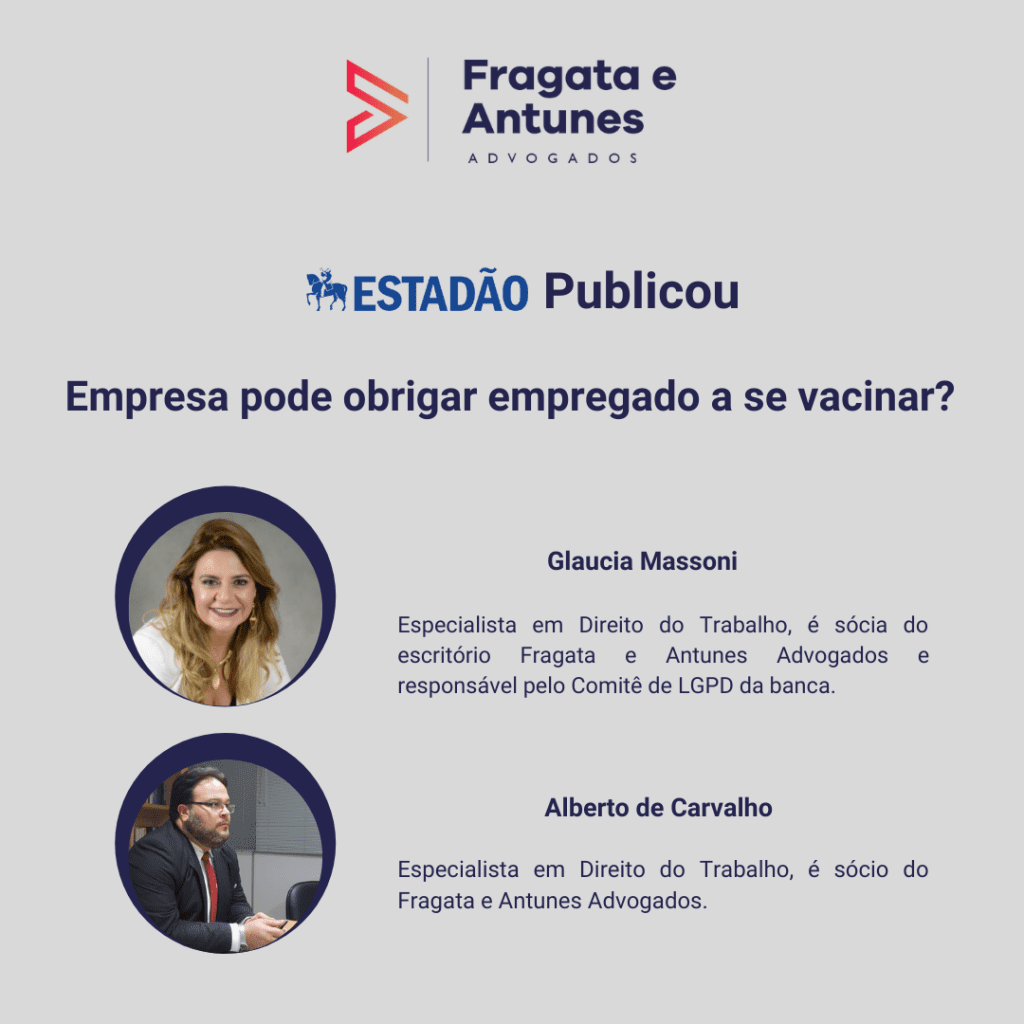 Estadão Publicou: Empresas pode obrigar empregado a se vacinar?Posted on 5 de março de 20215 de março de 2021By Informatica FEAPosted in Fragata e Antunes na Mídia Artigo elaborado por nossa sócia Glaucia Massoni e Alberto de Carvalho Clique aqui